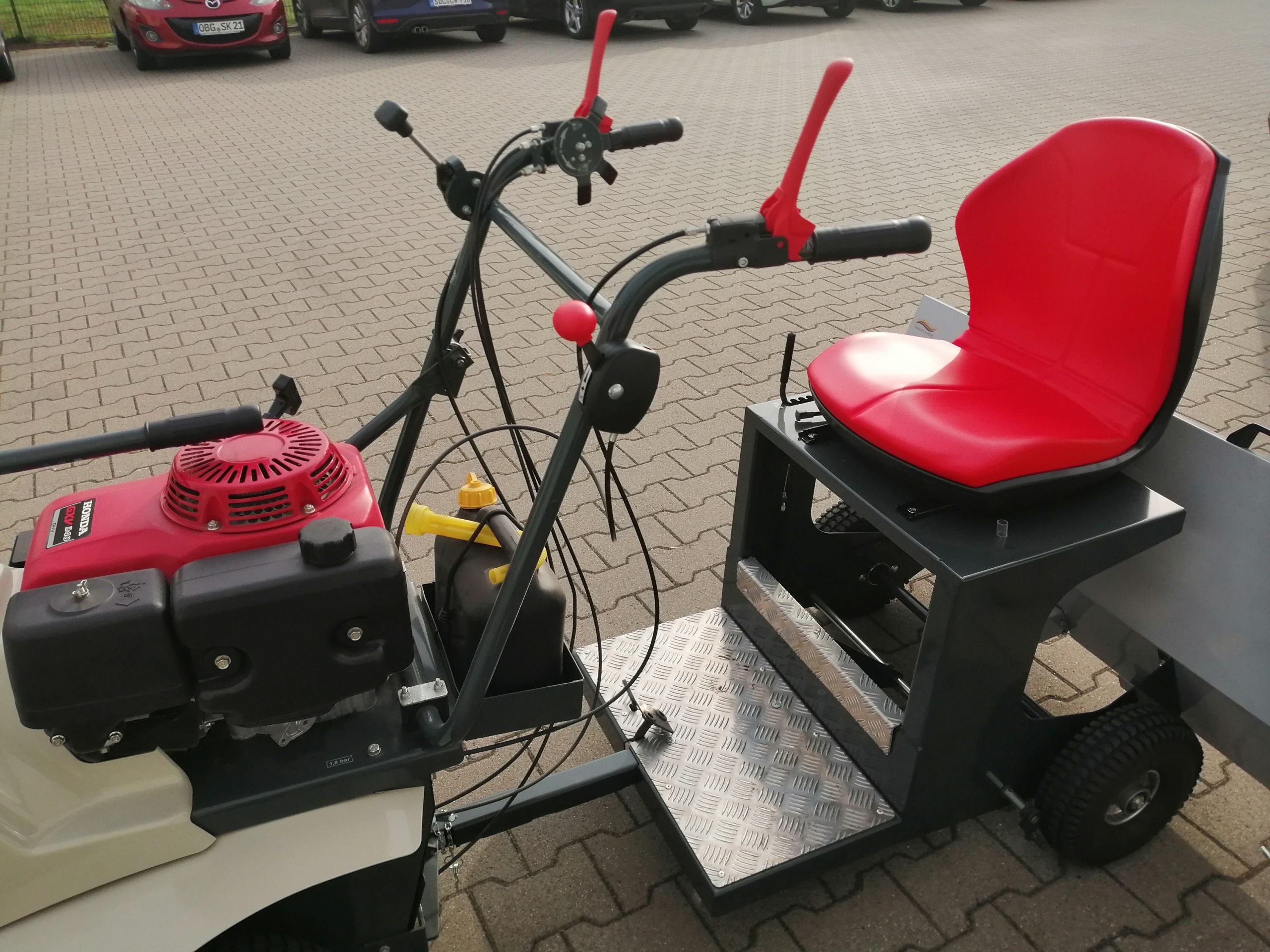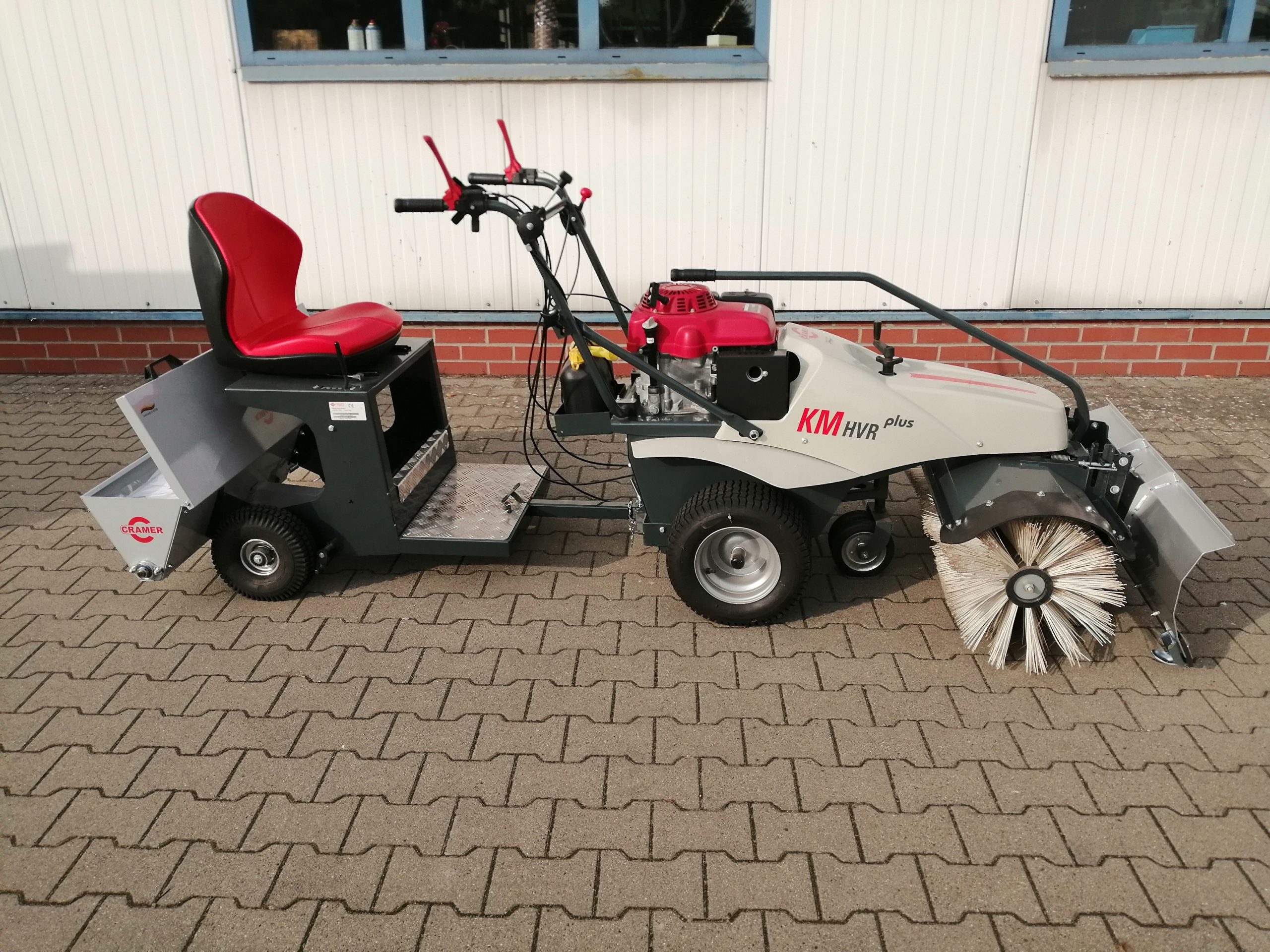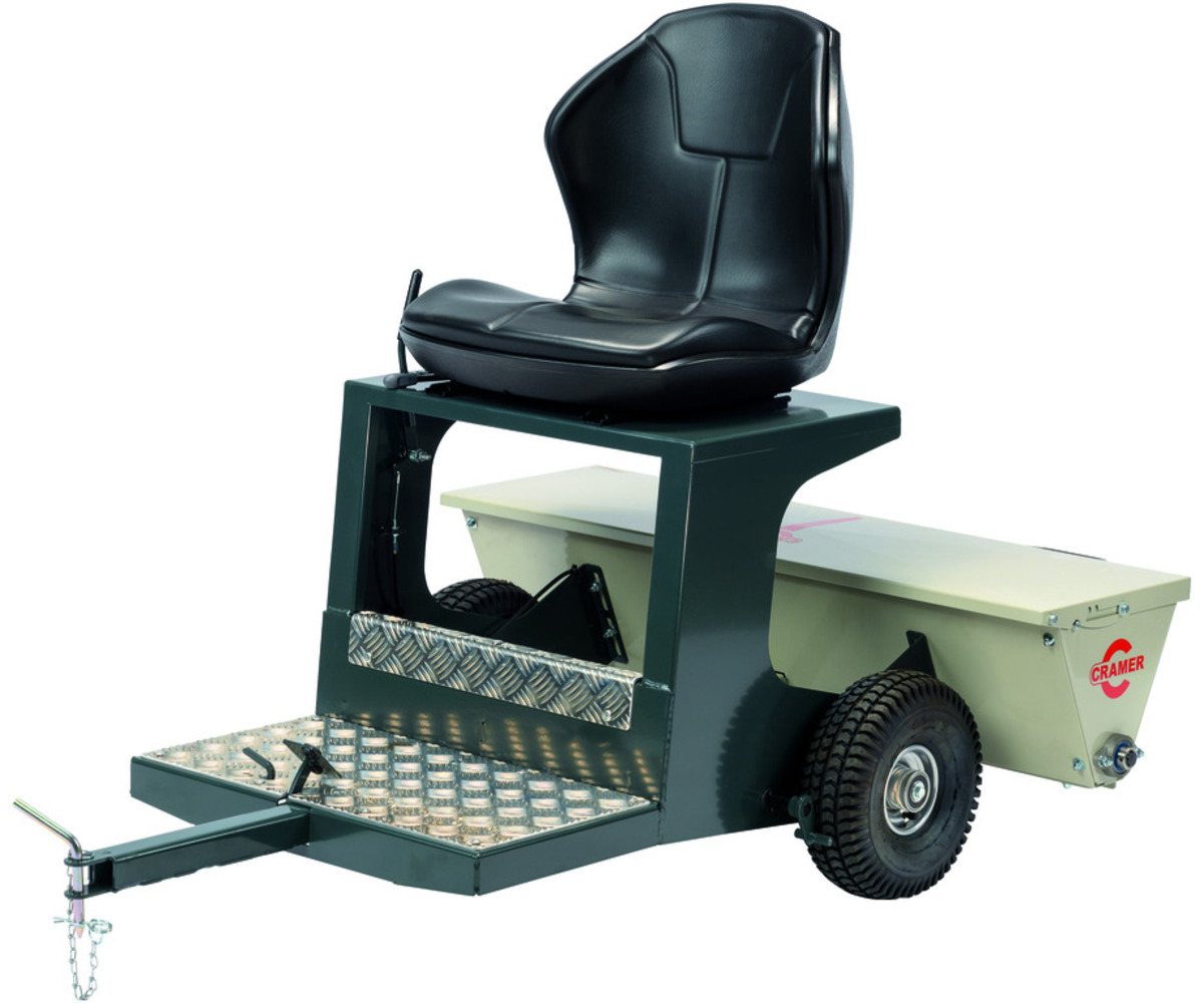 Für das Spitzenmodell KM HVR gibt es einen Sulky mit Streugutbehälter hinterm Sitz. So lässt sich die Maschine im Sitzen steuern und dabei auf einem Meter Breite wahlweise Granulat oder Salz streuen. Das Volumen von z.B. 35 Kg Salz ergibt ca. 4 Km “Streu-Reichweite”.